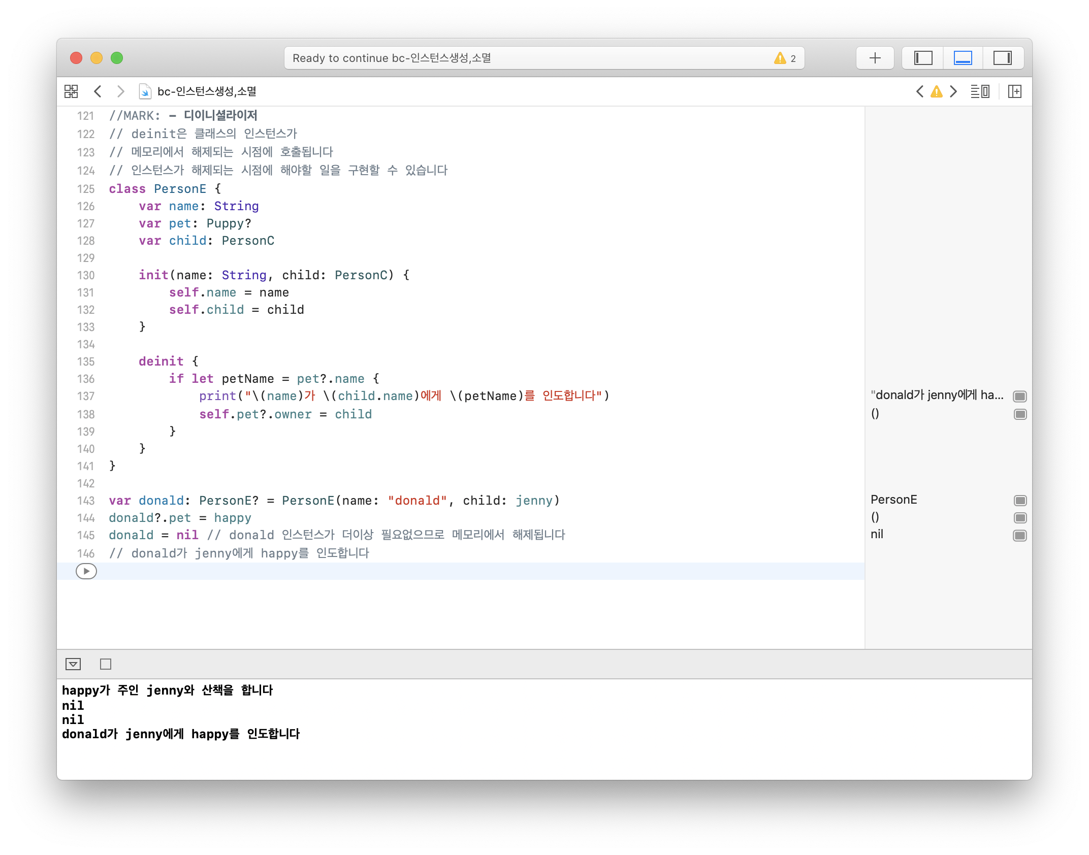 - deinitμ ν΄λμ€μ μΈμ€ν΄μ€κ° λ©λͺ¨λ¦¬μμ ν΄μ λλ μμ μ νΈμΆλλ€.