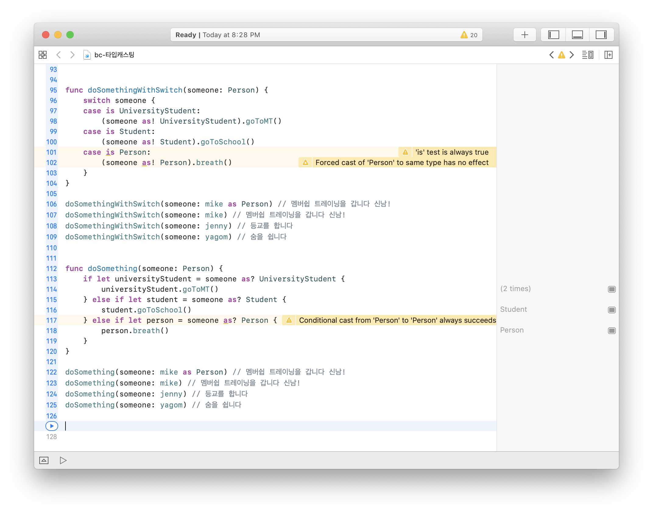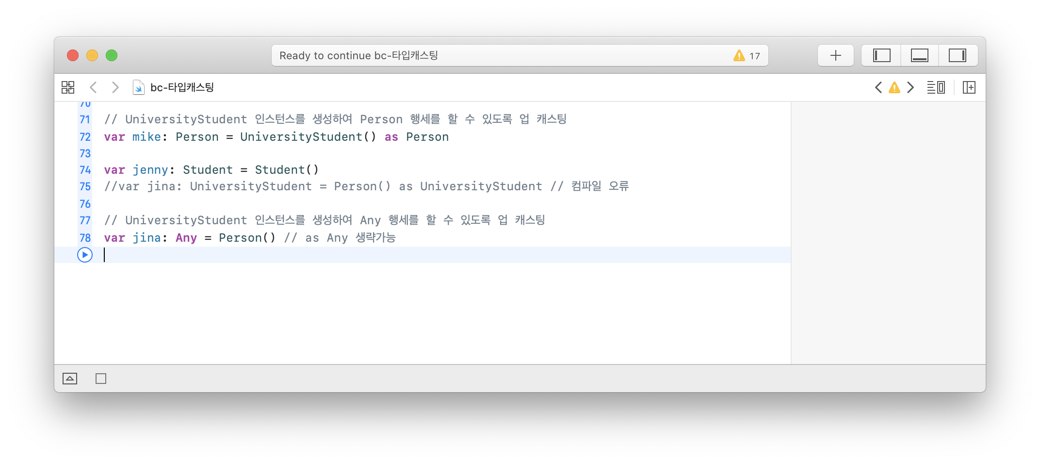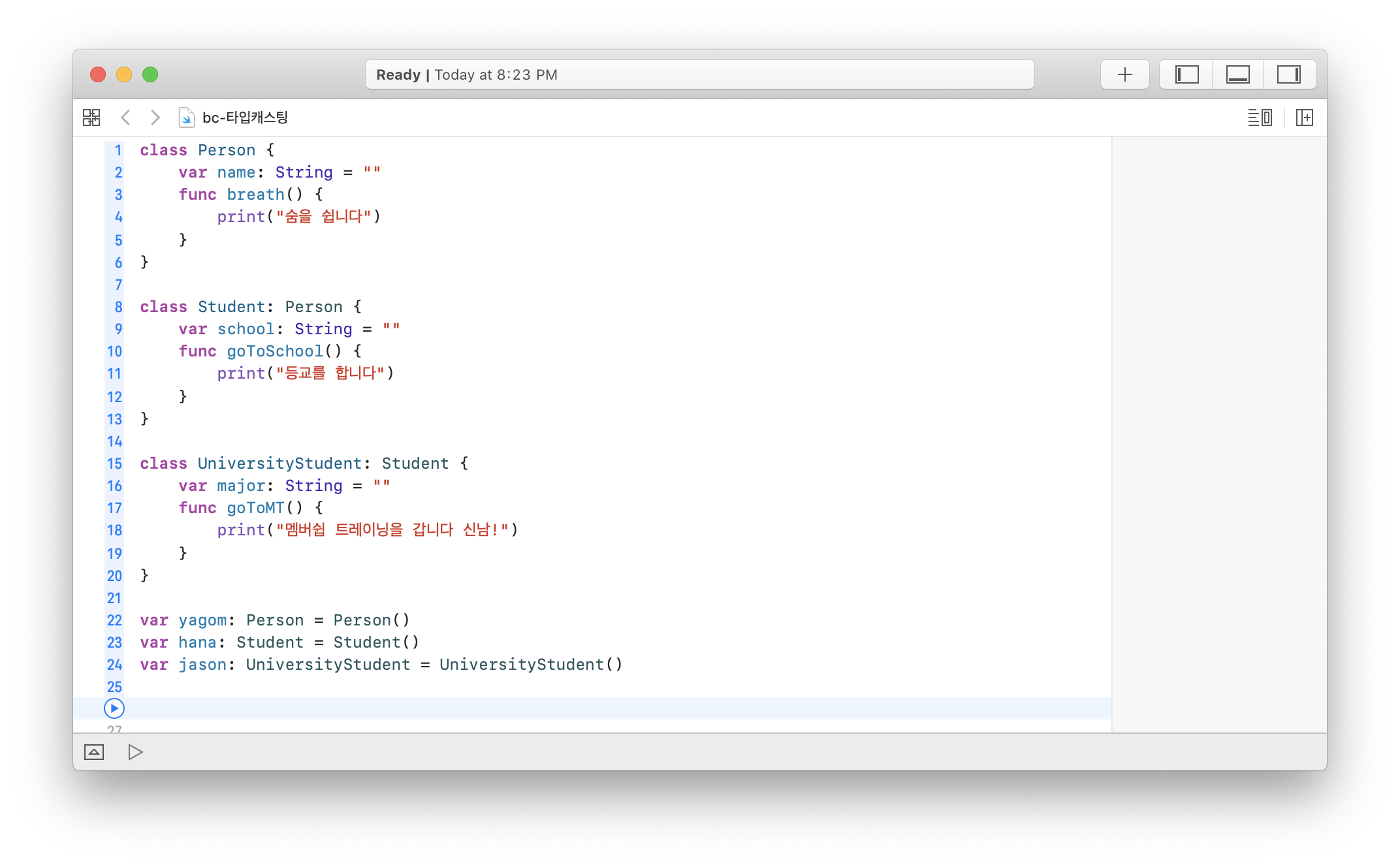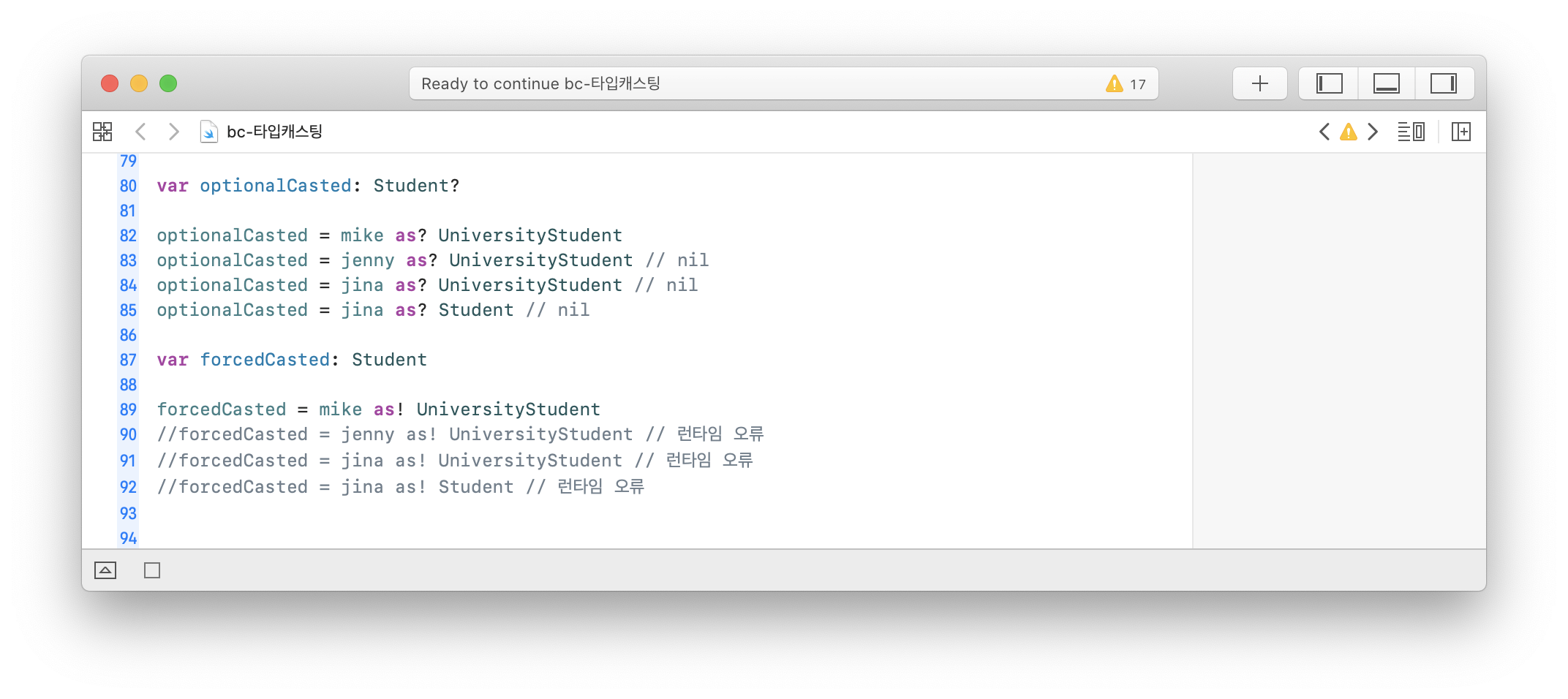 as? λλ as!λ₯Ό μ¬μ©νμ¬ μμ ν΄λμ€μ μΈμ€ν΄μ€λ‘ μ¬μ©ν μ μλλ‘ μ»΄νμΌλ¬μκ² μΈμ€ν΄μ€μ νμ μ 보λ₯Ό μ νν΄μ€λ€.