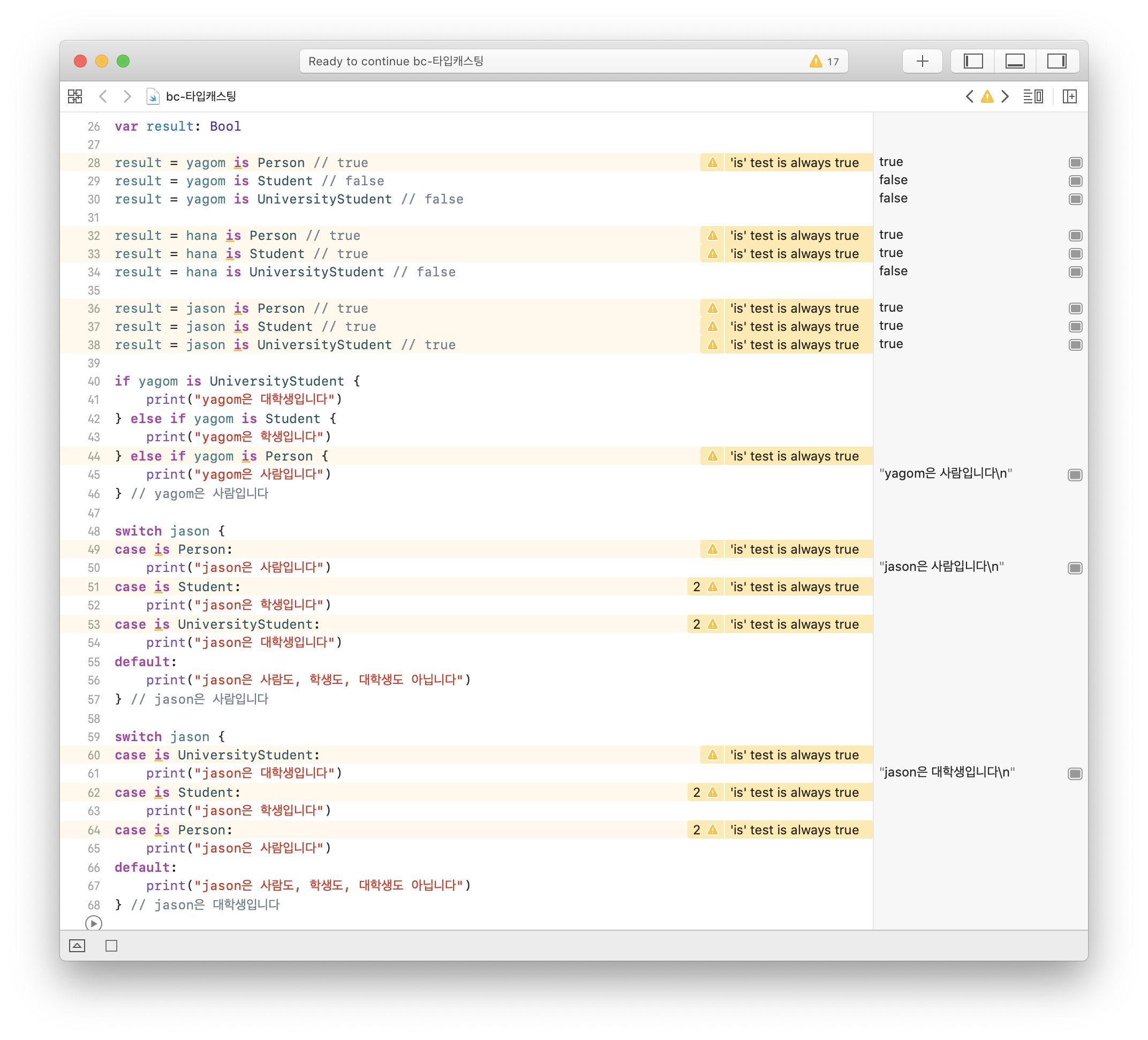 as? λλ as!λ₯Ό μ¬μ©νμ¬ μμ ν΄λμ€μ μΈμ€ν΄μ€λ‘ μ¬μ©ν μ μλλ‘ μ»΄νμΌλ¬μκ² μΈμ€ν΄μ€μ νμ μ 보λ₯Ό μ νν΄μ€λ€.