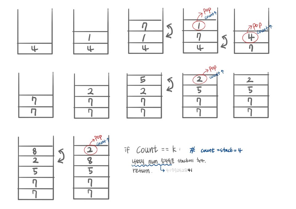 - 빼낸 숫자가 k와 같아지면 num의 나머지 숫자들을 stack에 추가해주고 끝낸다.
