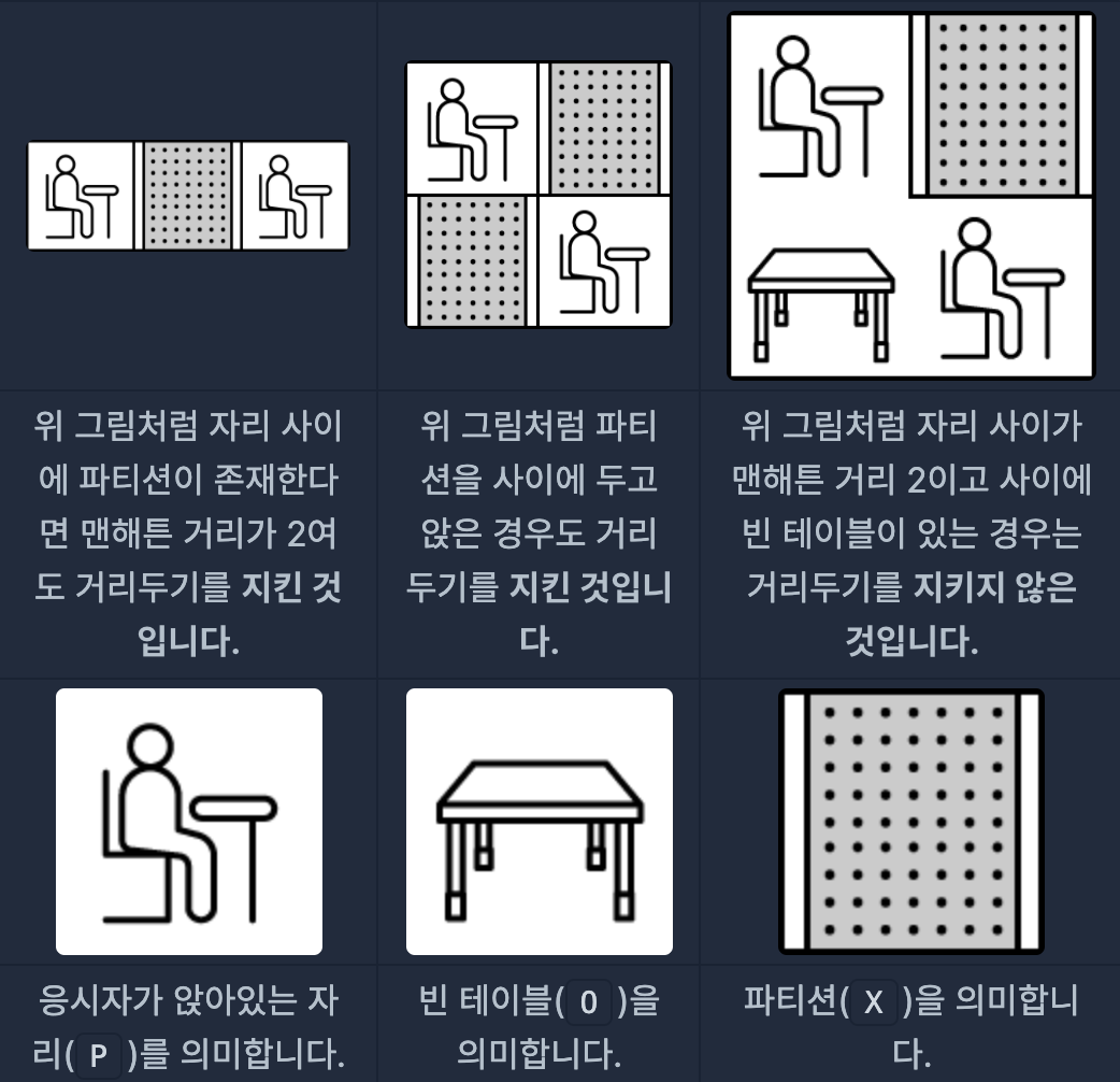 1. 문제 설명 개발자를 희망하는 죠르디가 카카오에 면접을 보러 왔습니다. 코로나 바이러스 감염 예방을 위해 응시자들은 거리를 둬서 대기를 해야하는데 개발 직군 면접인 만큼 아래와 같은 규칙으로 대기실에 거리를 두고 앉도록 안내하고 있습니다. 대기실은 5개이며, 각 대기실은 5x5 크기입니다. 거리두기를 위하여 응시자들 끼리는 맨해튼 거리1가 2 이하로 앉지 말아 주세요. 단 응시자가 앉아있는 자리 사이가 파티션으로 막혀 있을 경우에는 허용합니다. 예를 들어, 5개의 대기실을 본 죠르디는 각 대기실에서 응시자들이 거리두기를 잘 기키고 있는지 알고 싶어졌습니다. 자리에 앉아있는 응시자들의 정보와 대기실 구조를 대기실별로 담은 2차원 문자열 배열 places가 매개변수로 주어집니다. 각 대기실별로 거리두기를..
