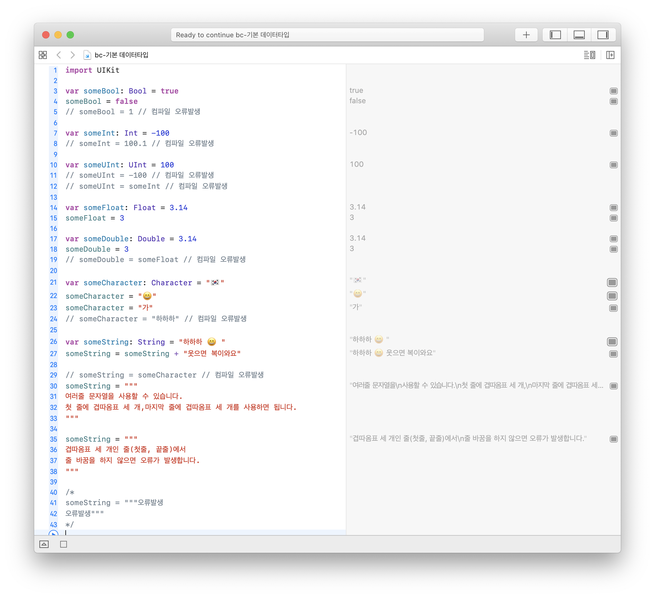 if-else switch - if-else 구문 if-else 구문의 기본 형태 if만 단독으로 사용해도되고, else, else if 와 조합해서 사용 가능하다. if 뒤의 조건 값에는 Bool 타입의 값만 위치해야 한다. 조건을 감싸는 소괄호는 선택사항이다. let someInteger = 100 if someInteger 100 { print("100 초과") } else { print("100") } // 100 // 스위프트의 조건에는 항상 Bool 타입이 들어와야 한다. // someInteger는 Bool 타입이 아닌 Int 타입이기 때문에 컴파일 오류가 발생한다. //if someInteger { } (..